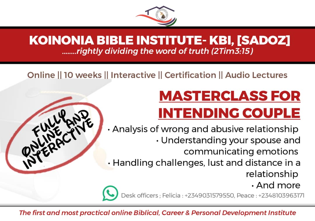 Categories: All Courses, MARITAL COURSES Tags: Ife Adetona, KBI, KBI Courses, Masterclass for Intending Couples, Pastor Ife Adetona, SADOZ, sadoz courses